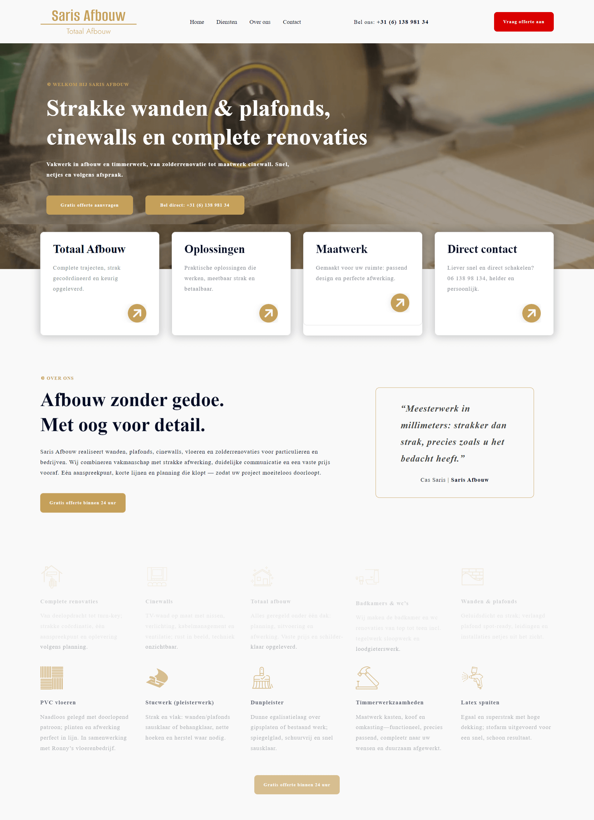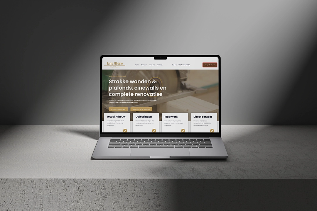 Het design is strak en professioneel, passend bij het vakwerk van Saris Afbouw.