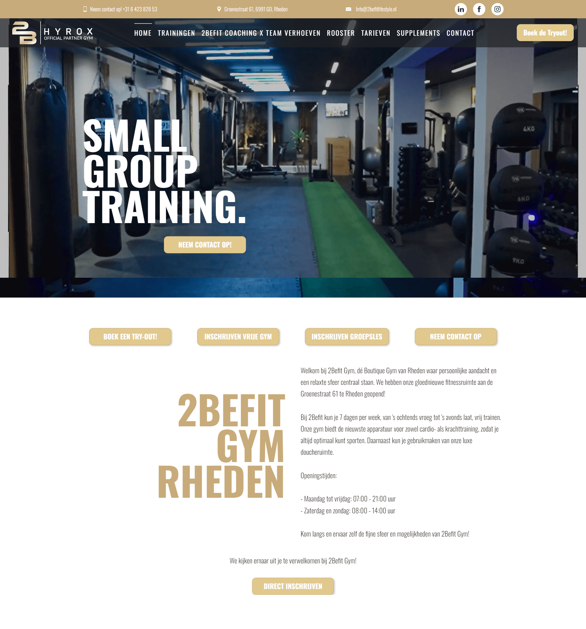 De vormgeving is professioneel en sportief, met heldere call-to-actions en inspirerende teksten die energie en motivatie uitstralen.